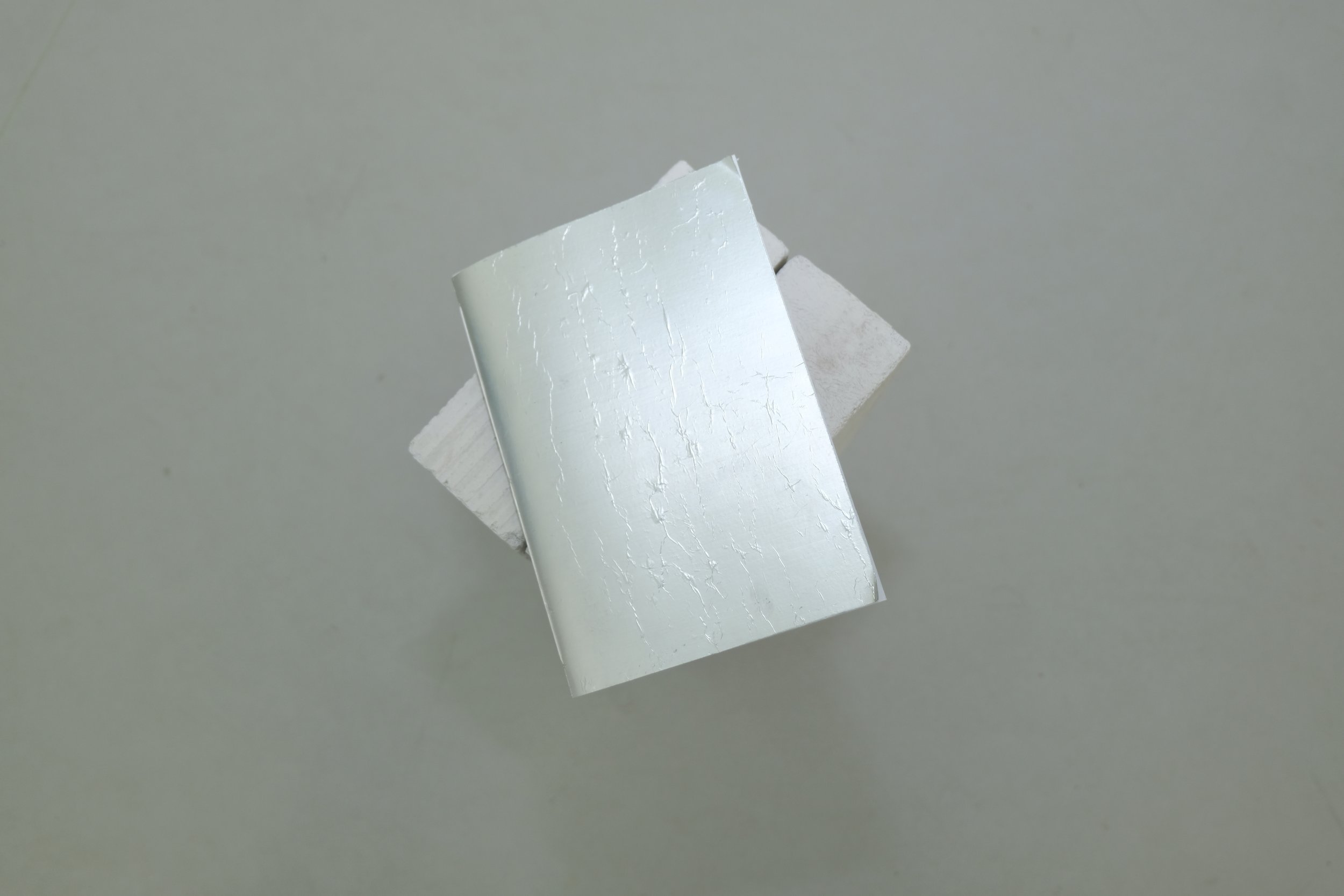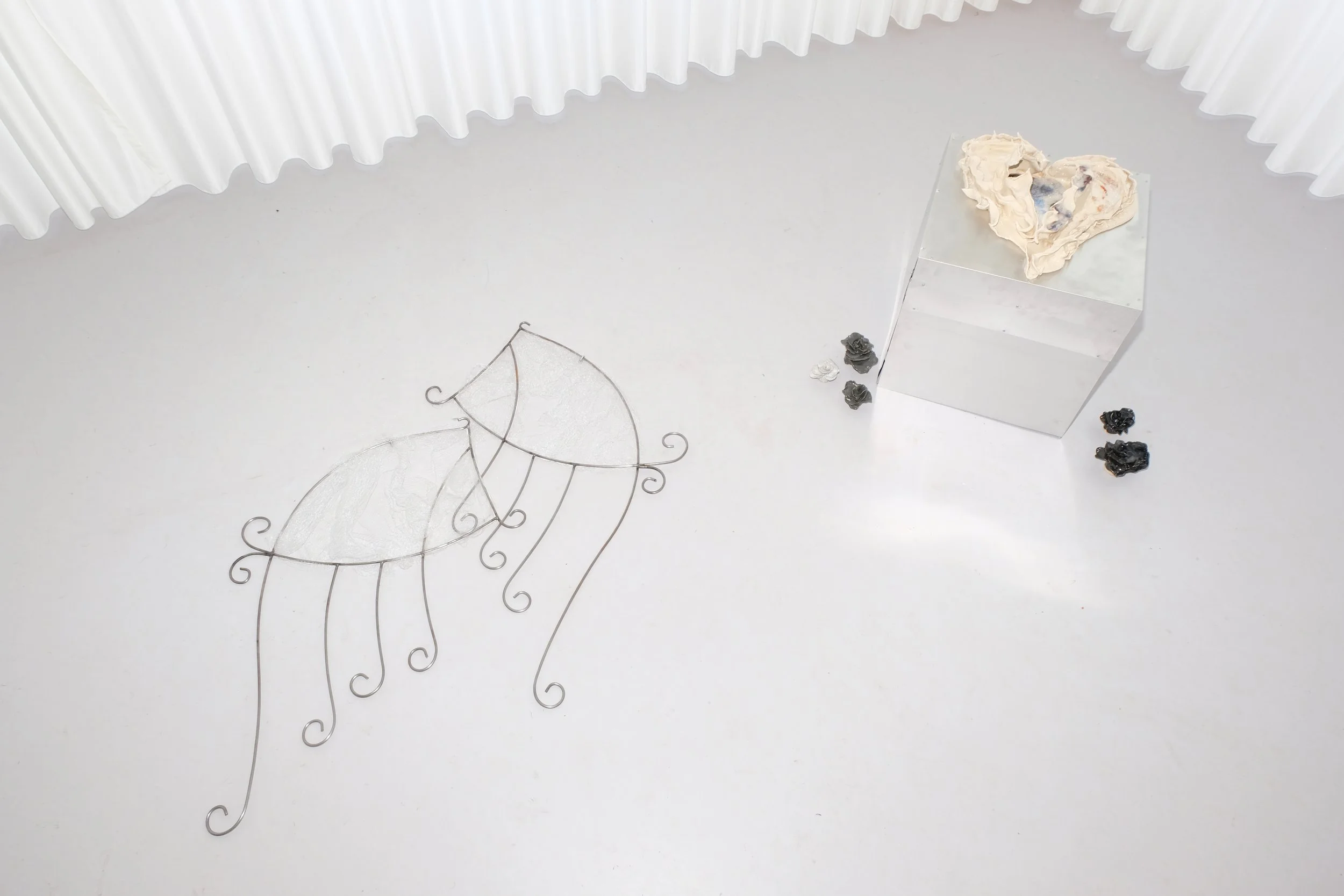 Ceramic heart, self experimented special glaze, steel wings and rod, knitted polyester monofilament, sublimation printing, handcrafted aluminum table, hand-bound book
