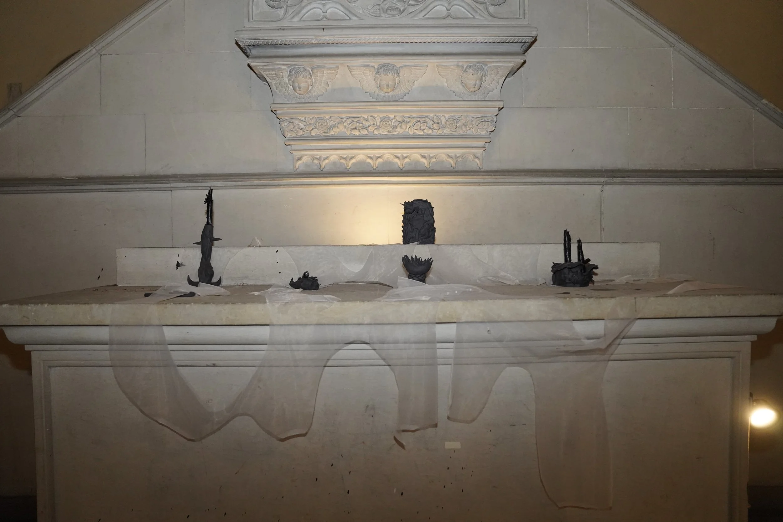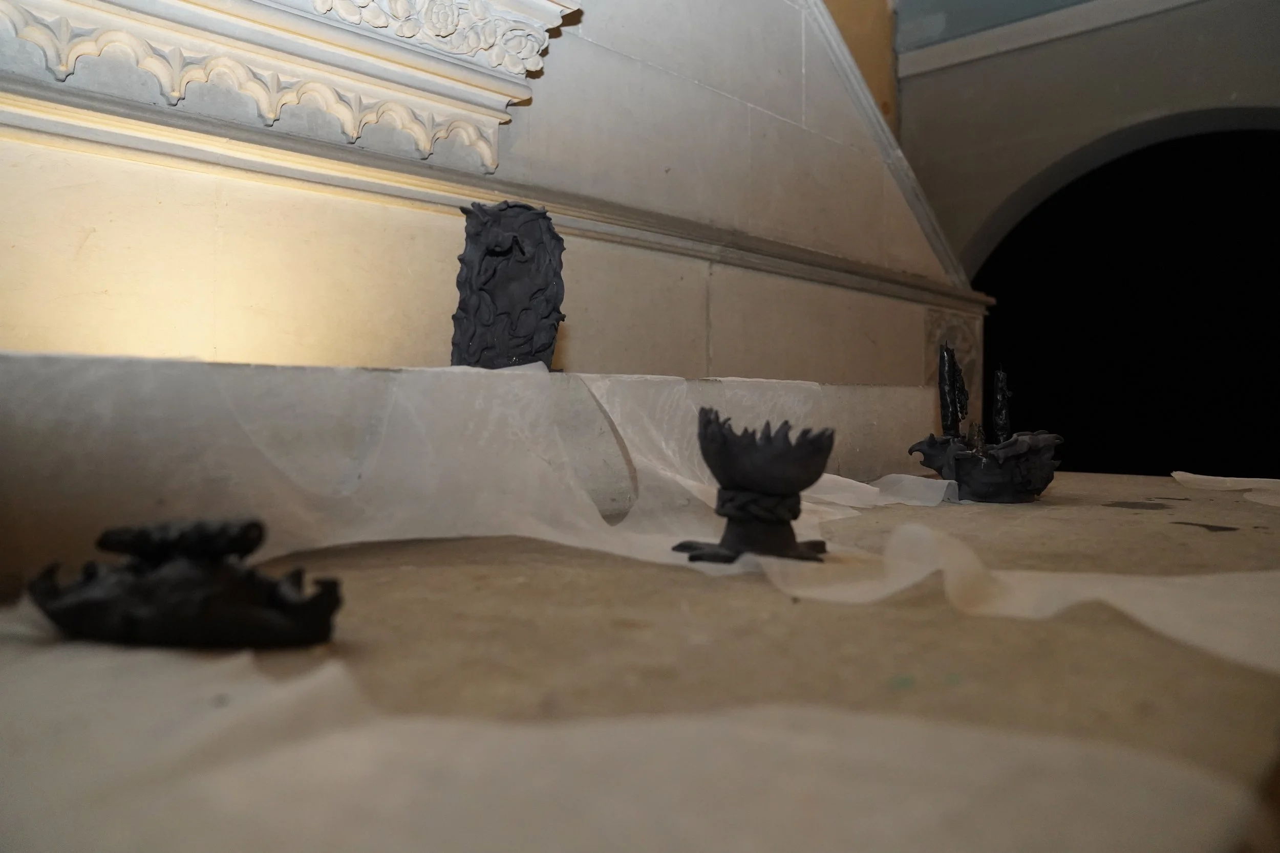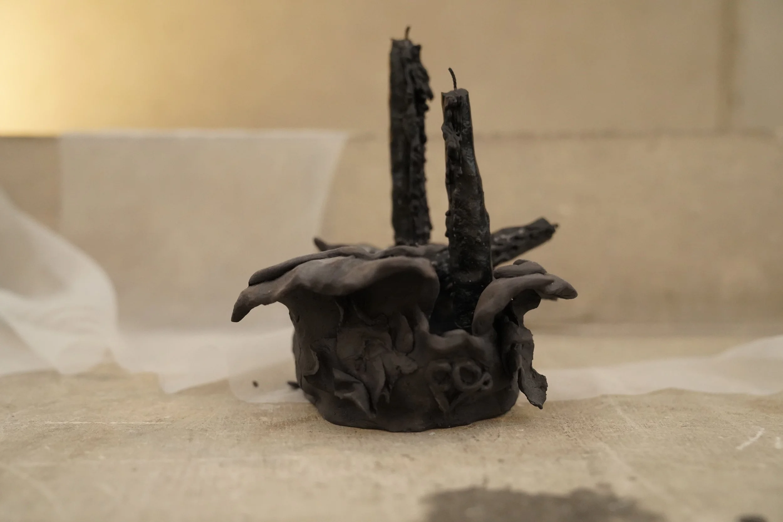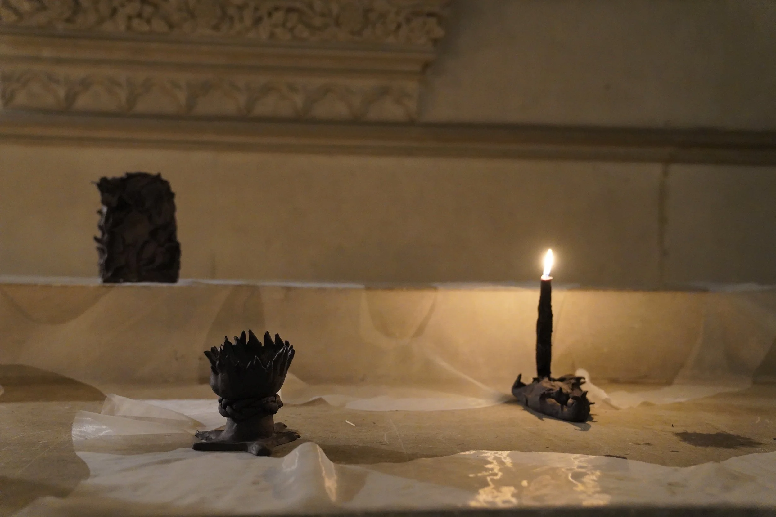 The Black Altar of Consciousness is an installation staged as a spiritual altar and portal to the unconscious. The base is a fabric altar on which ceramic vessels with candles are arranged, complemented by a bowl that can contain water or other symbolic liquids. The altar, made of black porcelain, charcoal on satin and chiffon, and wax, embodies the idea of access to the “dark side” of the self.