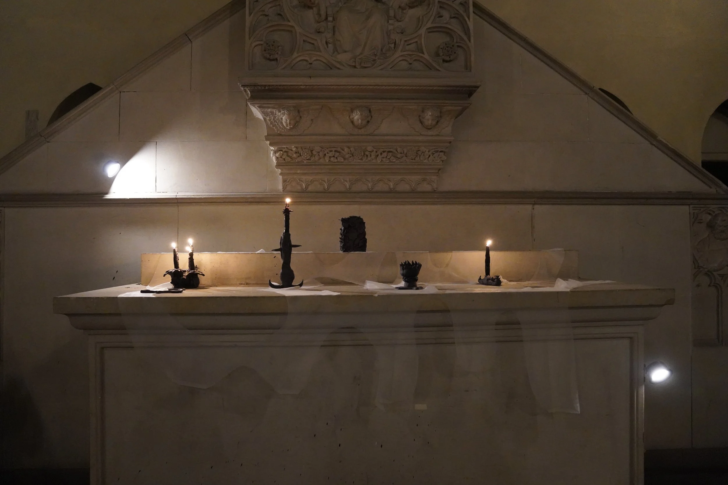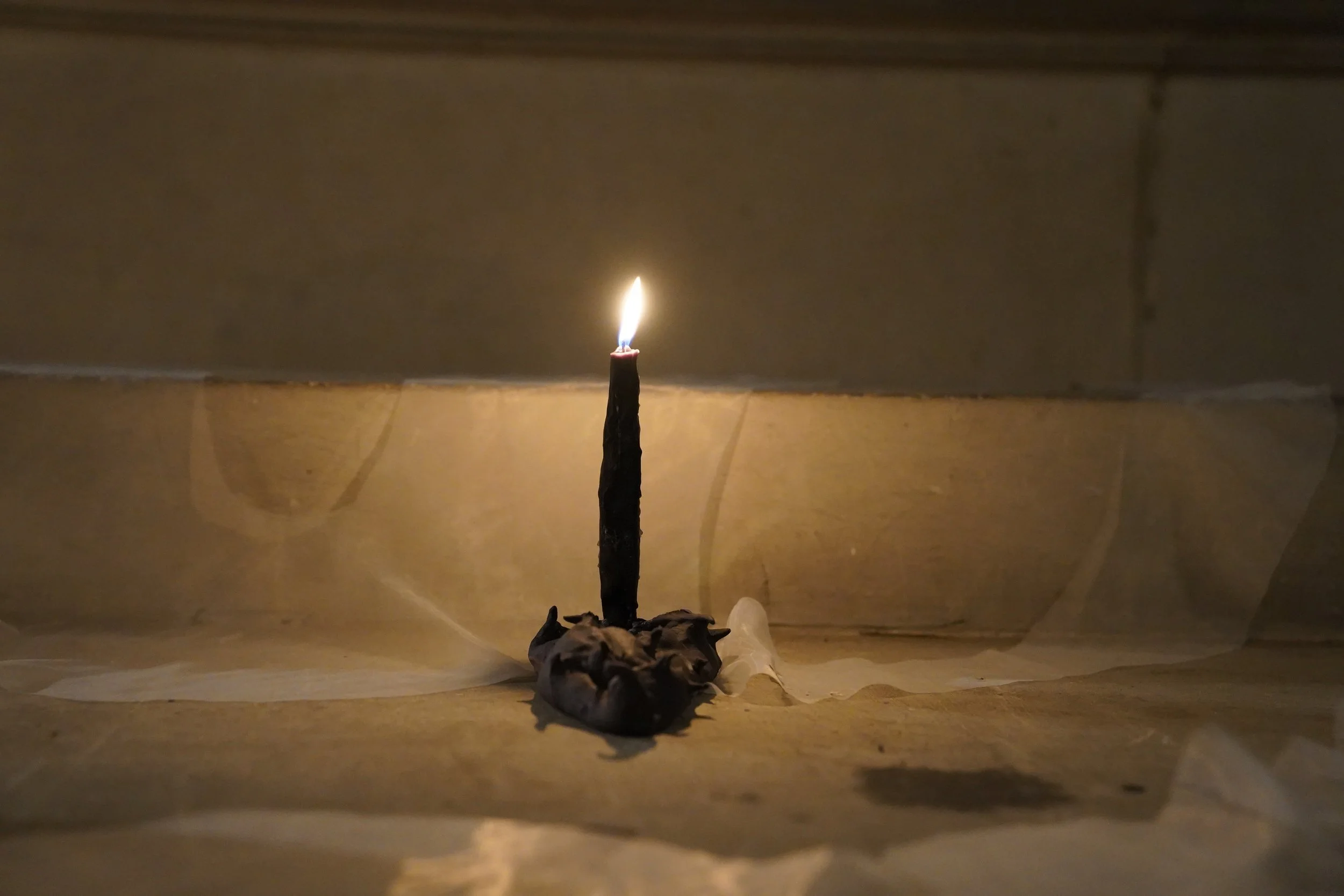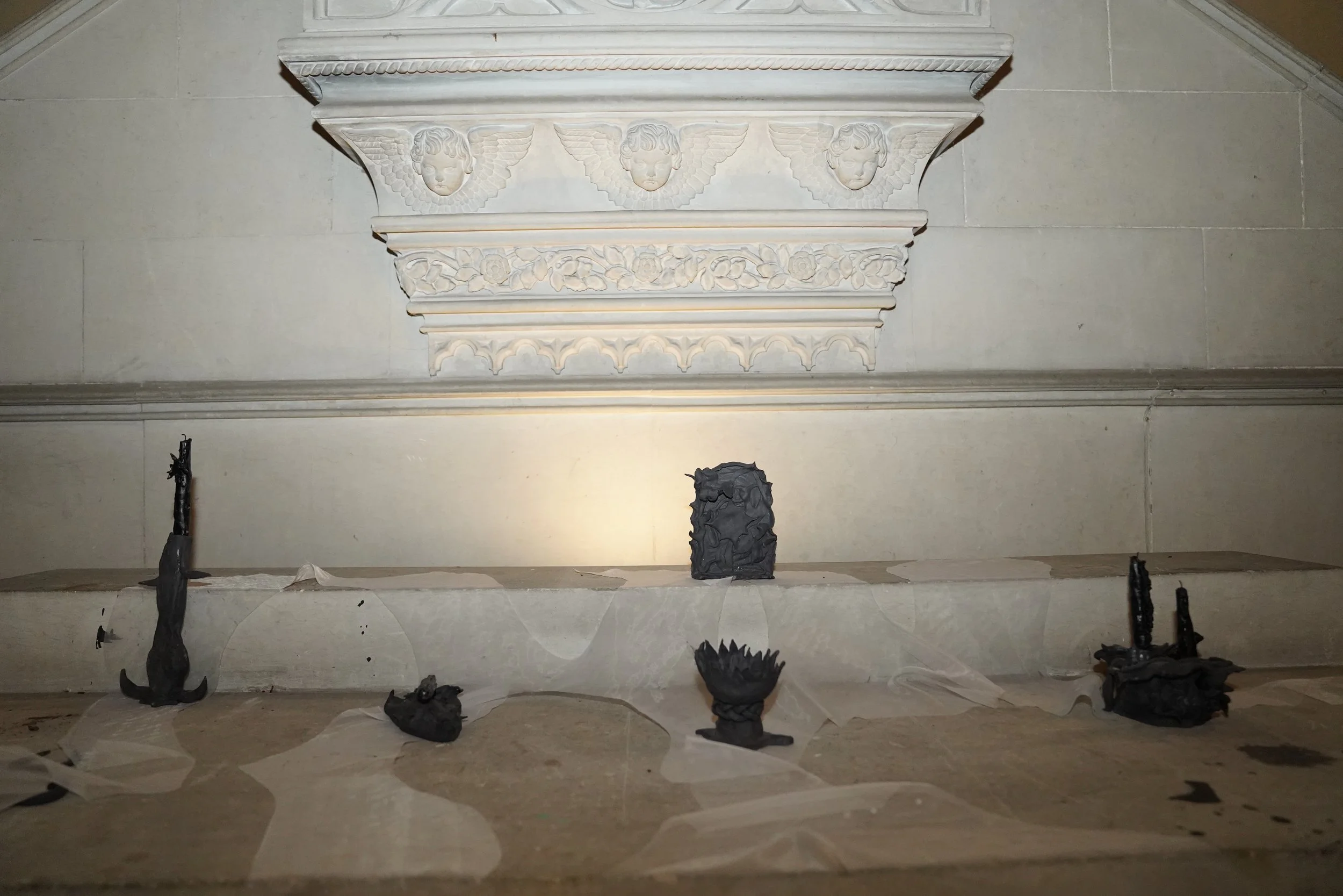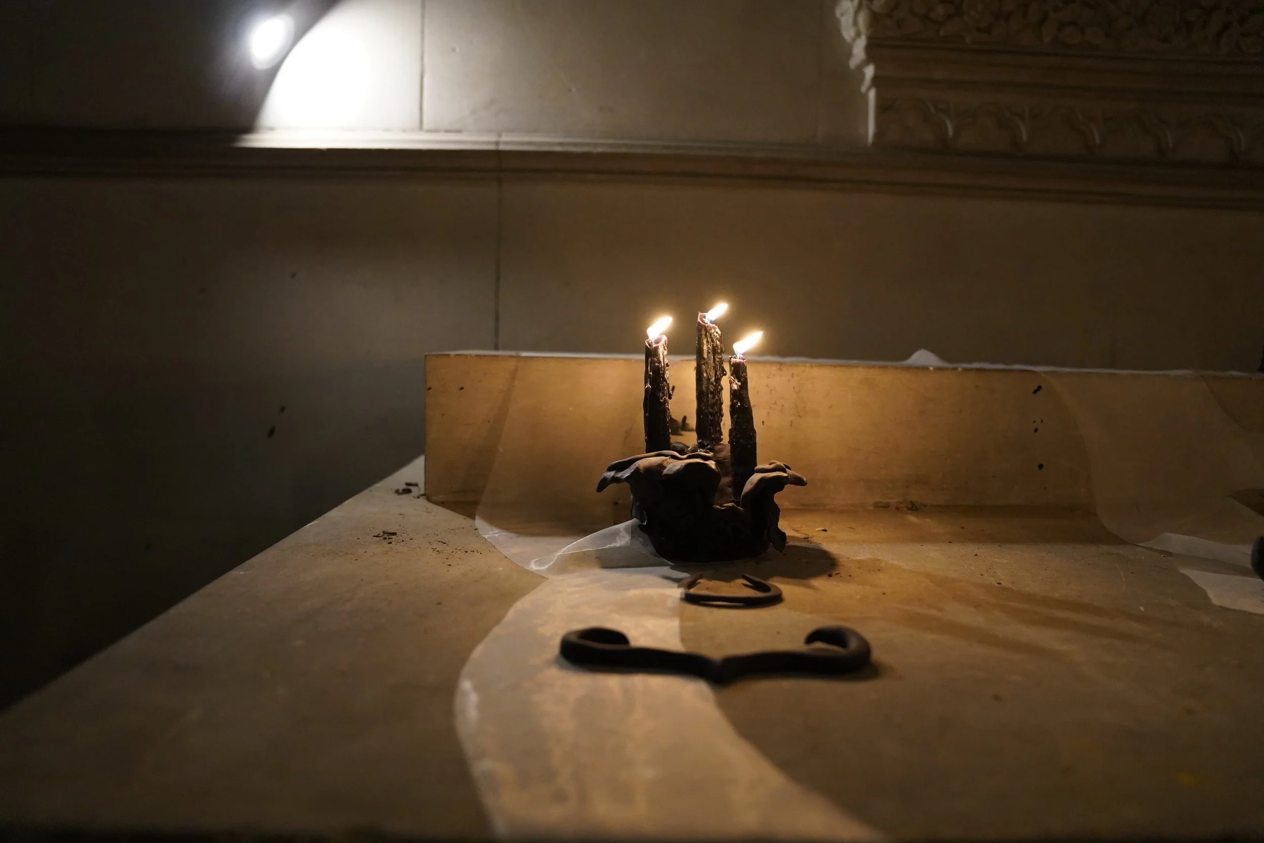 The Black Altar of Consciousness is an installation staged as a spiritual altar and portal to the unconscious. The base is a fabric altar on which ceramic vessels with candles are arranged, complemented by a bowl that can contain water or other symbolic liquids. The altar, made of black porcelain, charcoal on satin and chiffon, and wax, embodies the idea of access to the “dark side” of the self.