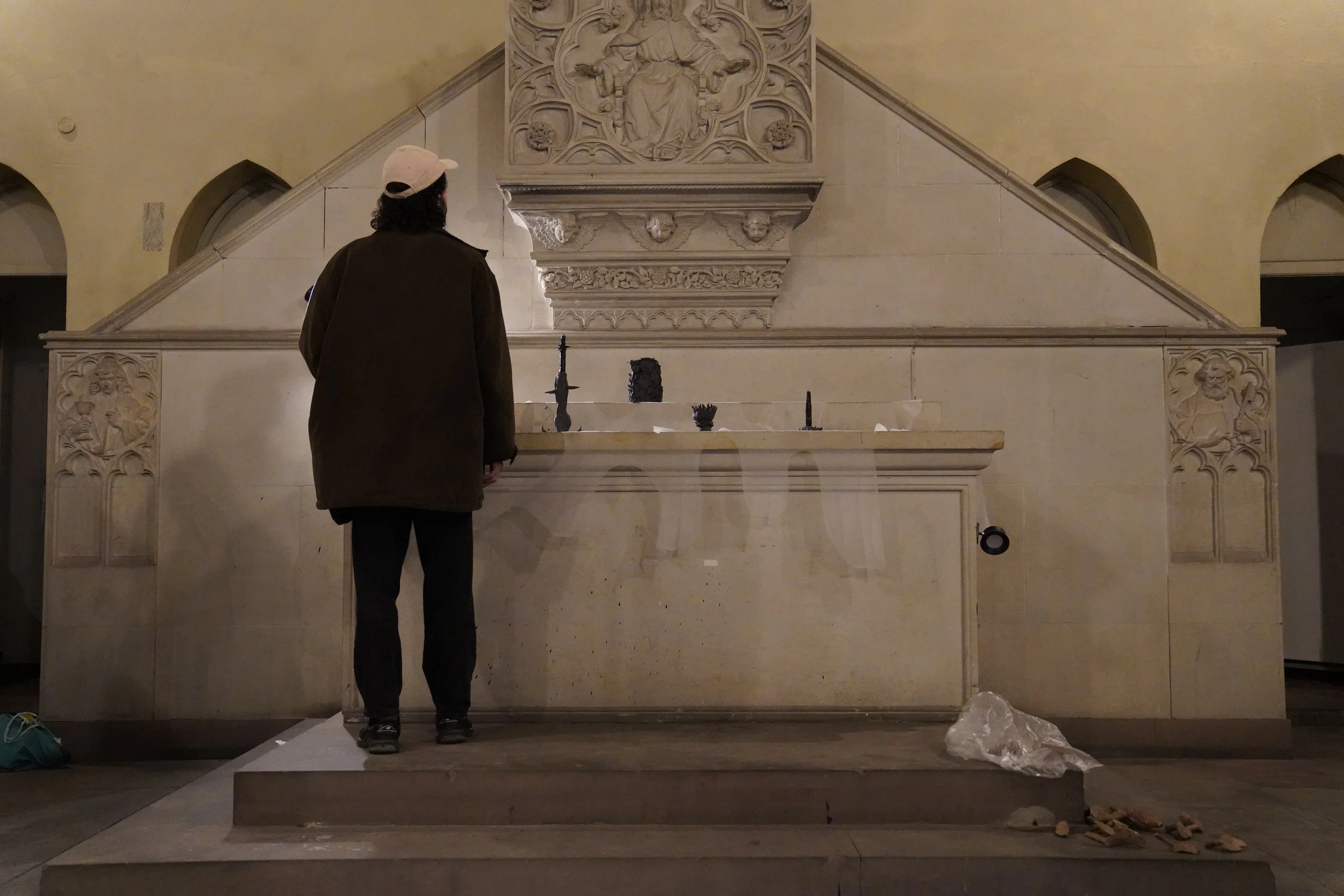The work creates a meditative and ritualistic atmosphere that invites viewers to enter into a dialogue with their own subconscious. The installation encourages us to turn to what is hidden within us and to engage in an inner dialogue with a new inner deity or an expanded self. The use of symmetry refers to spiritual perfection and harmony, which can only be achieved by confronting and accepting one's own shadow. The sentences and questions integrated into the installation – “How strange familiar you are. Who are you?” or “Do I not have enough of my own life to deal with?” – illuminate the tension and emptiness that people feel when they lose touch with their own soul. Carl Gustav Jung's Red Book served as an essential inspiration for this work.